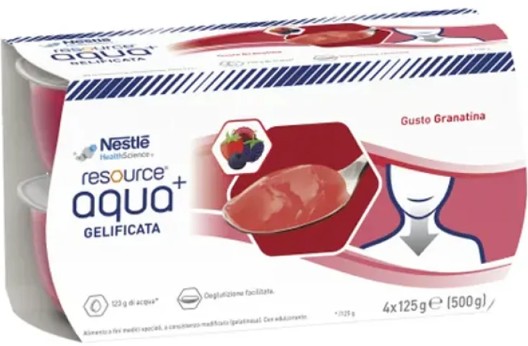 Resource® Aqua+ gelificata è un alimento a fini medici speciali studiato per dissetare e idratare in sicurezza e gradevolmente il paziente disfagico. Resource® Aqua+ gelificata è priva di glutine e lattosio. DOSI 4-8 vasetti al giorno (490-980 ml) o secondo il parere del medico.