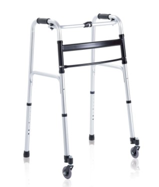 Deambulatore pieghevole costruito in alluminio anodizzato leggero con manopole anatomiche, puntali in gomma antiscivolo.