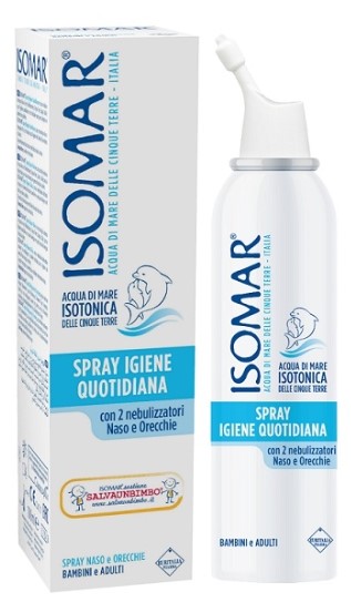 Isomar Spray Igiene Quotidiana, a base di acqua di mare isotonica, svolge un'azione fluidificante e può essere utilizzato sia per la detersione del naso che delle orecchie grazie alla presenza del doppio erogatore.